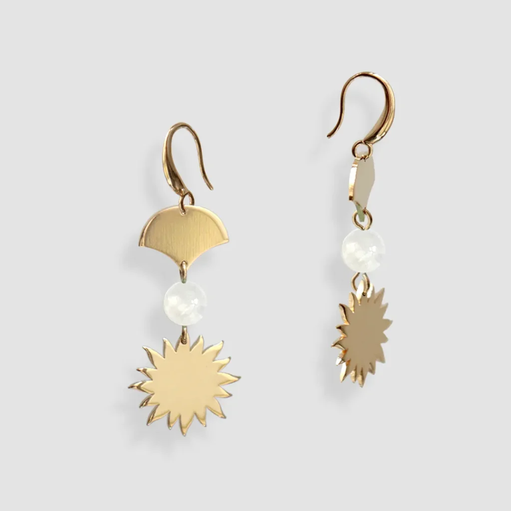 : Très tendance, ces boucles se composent d’une pierre de lune sur un côté et d’un design plus complexe ou allongé de l’autre.