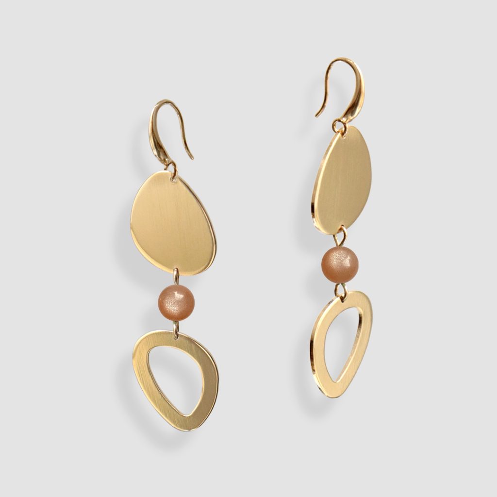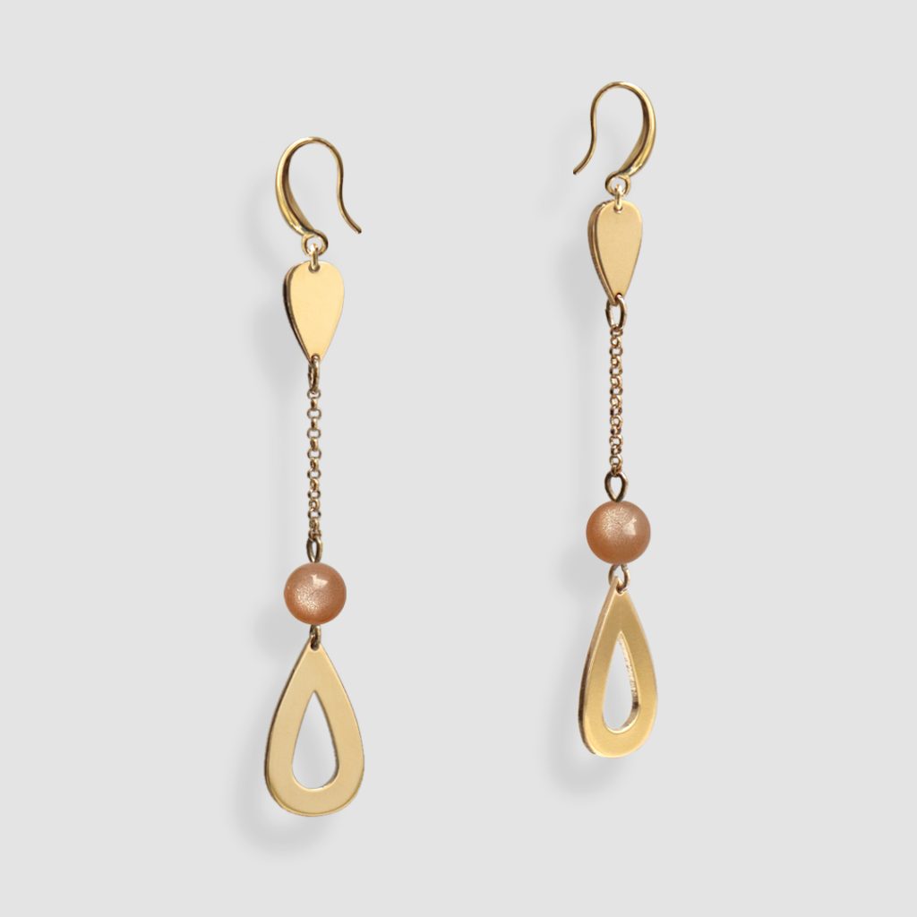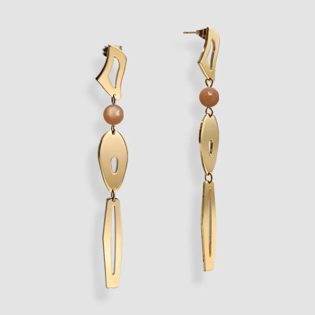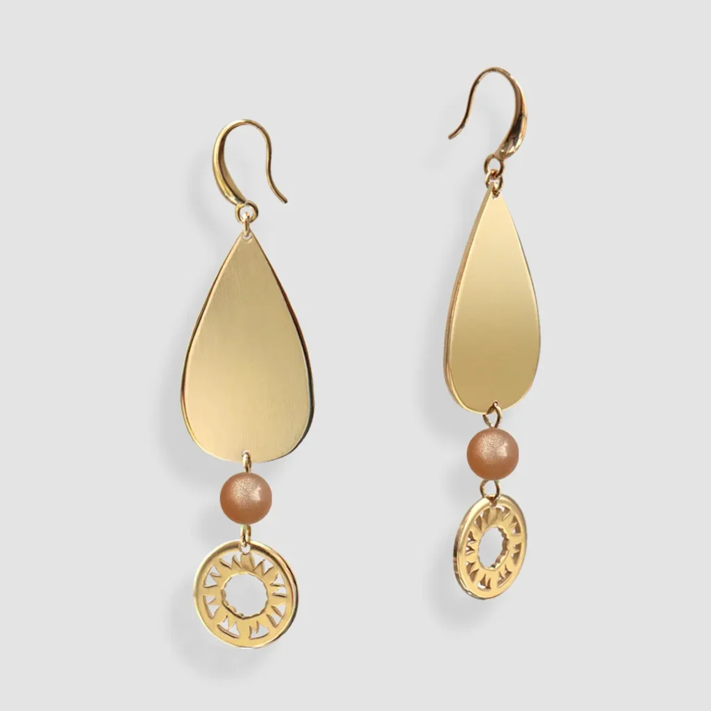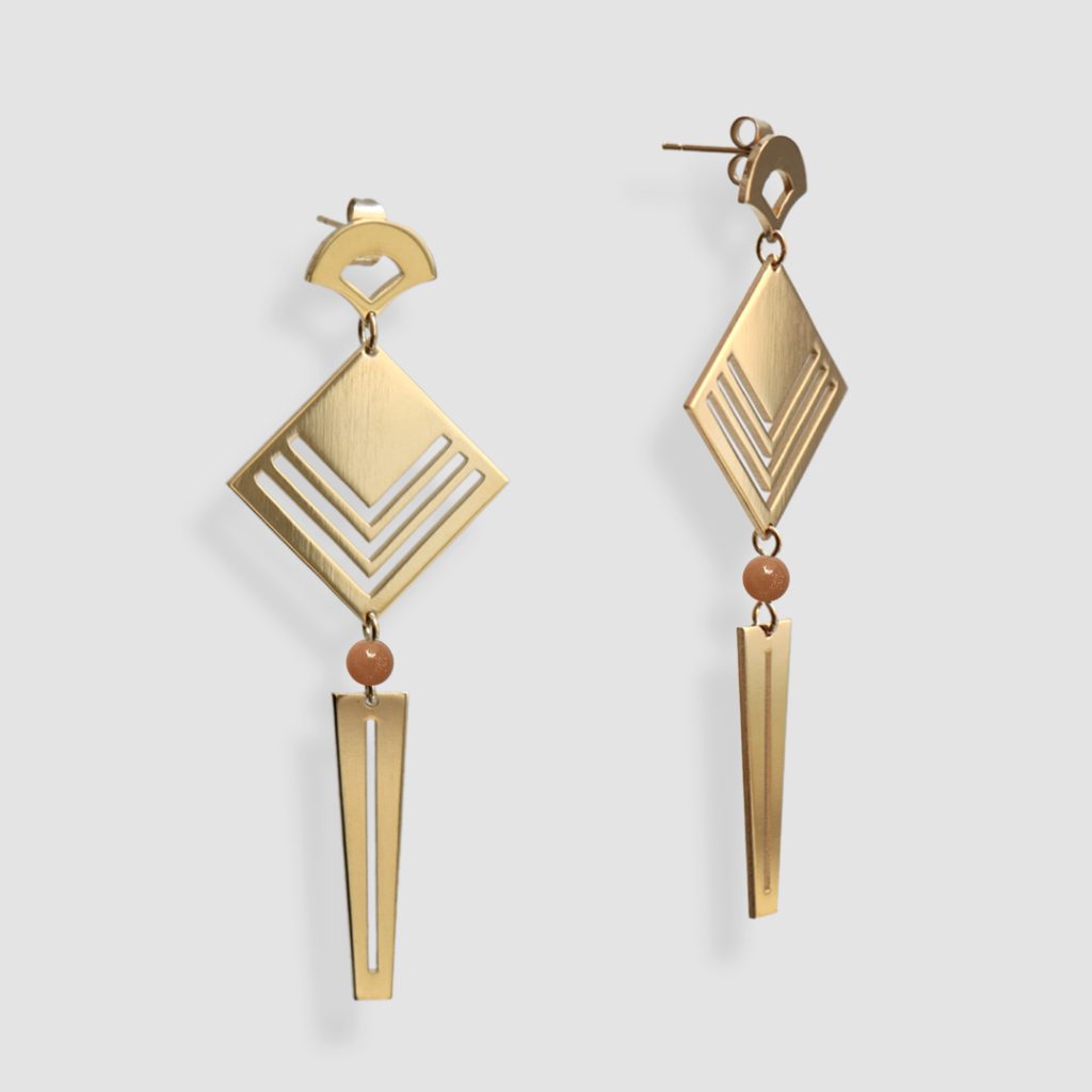 Pour une touche sophistiquée : Les boucles pendantes avec des pierres de soleil aux reflets cuivrés attirent naturellement le regard. Associez-les à une tenue monochrome pour un effet élégant et harmonieux.