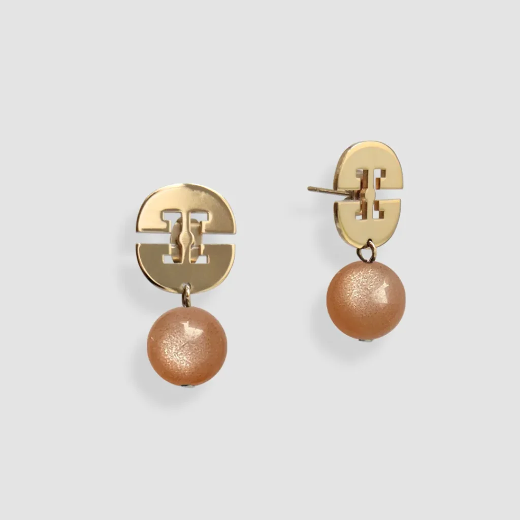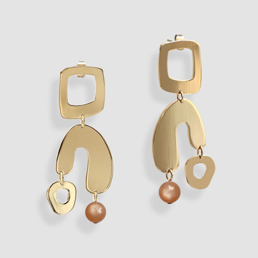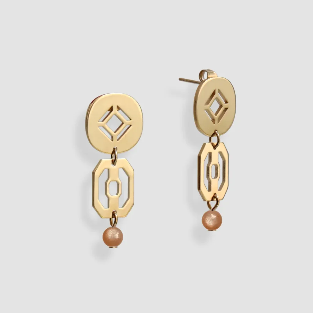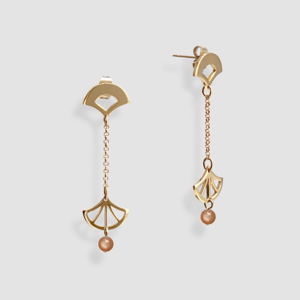 Pour une touche sophistiquée : Les boucles pendantes avec des pierres de soleil aux reflets cuivrés attirent naturellement le regard. Associez-les à une tenue monochrome pour un effet élégant et harmonieux.