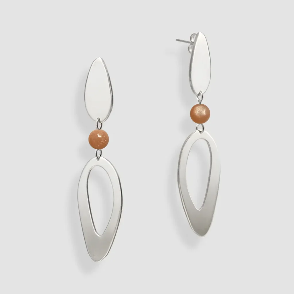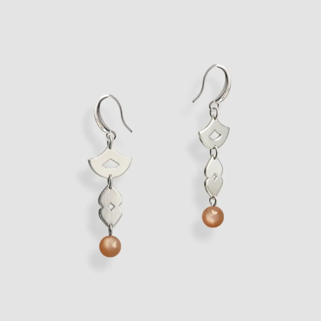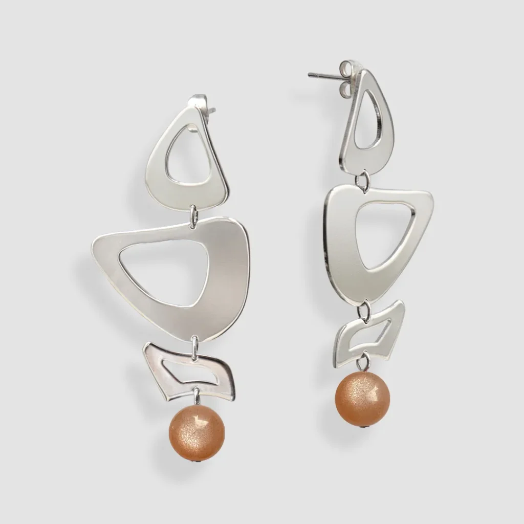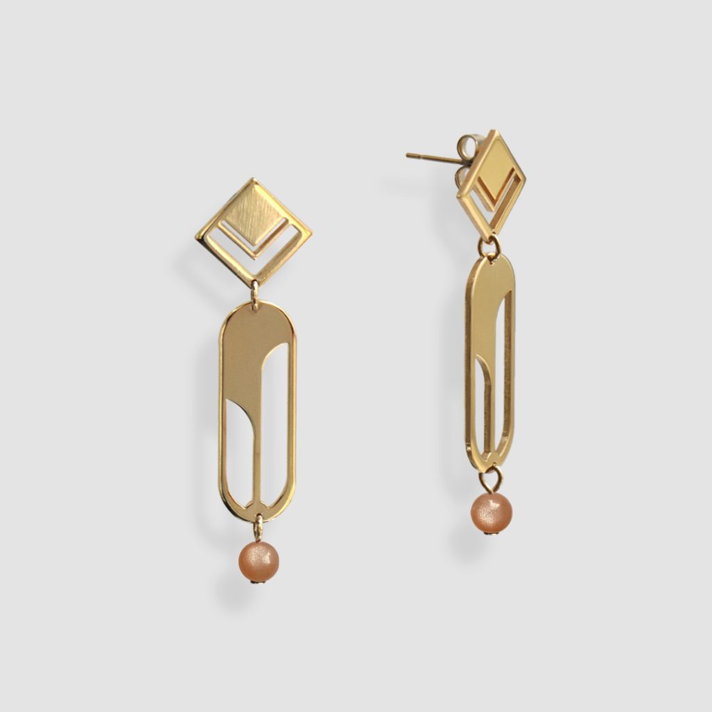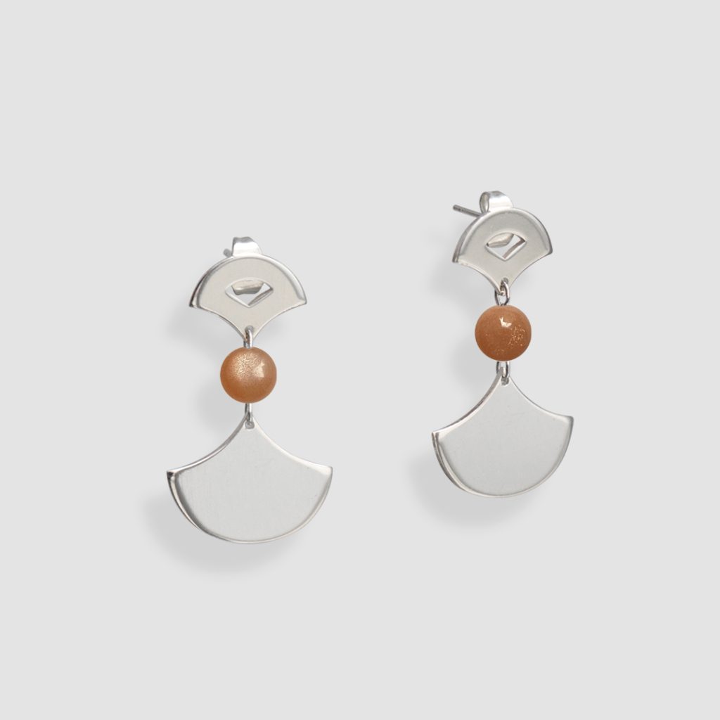 Pour une touche sophistiquée : Les boucles pendantes avec des pierres de soleil aux reflets cuivrés attirent naturellement le regard. Associez-les à une tenue monochrome pour un effet élégant et harmonieux.