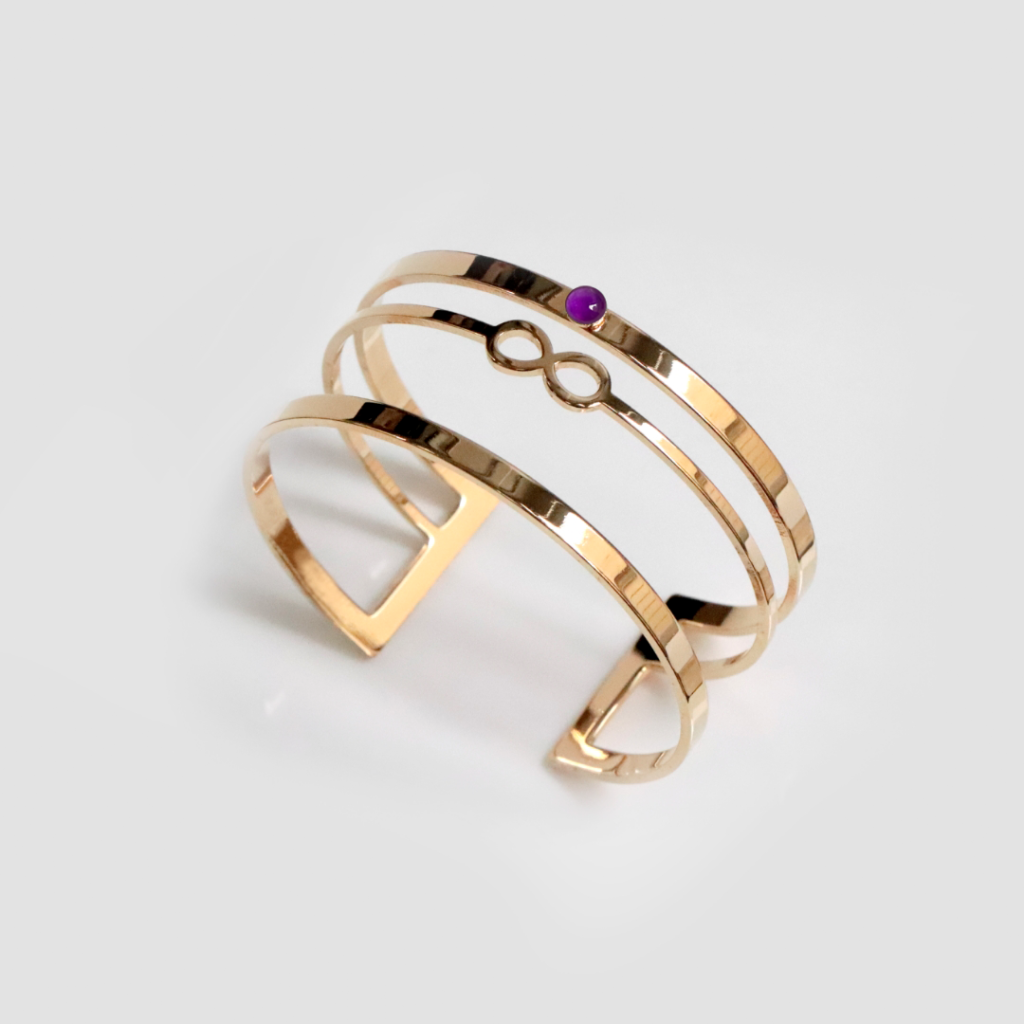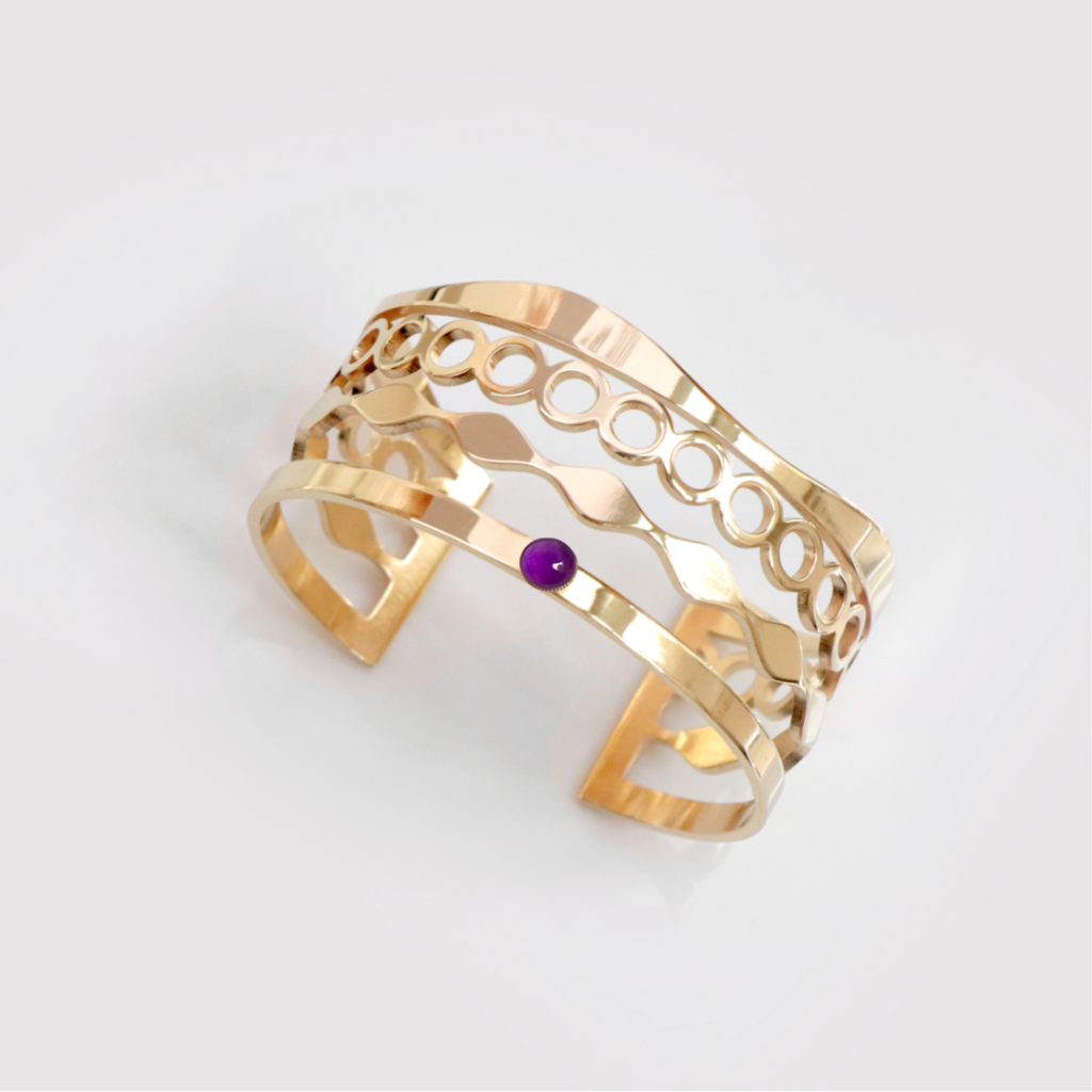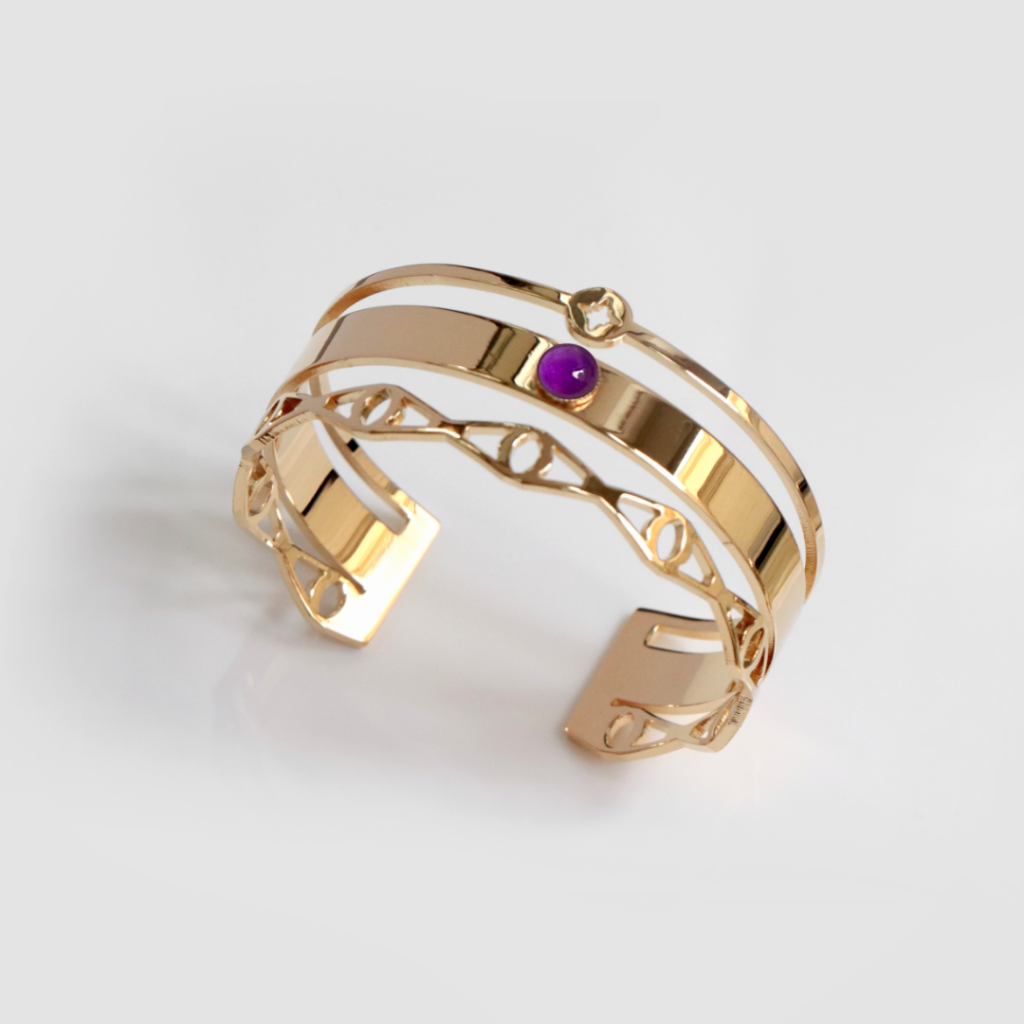 3. Un bracelet géométrique : Les bracelets géométriques utilisent des formes simples et modernes, comme des cercles, des triangles ou des rectangles. L’améthyste, pierre très tendance, donnera elle aussi au bijou son côté actuel.