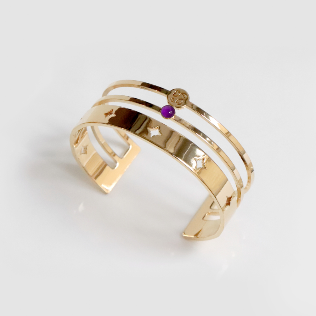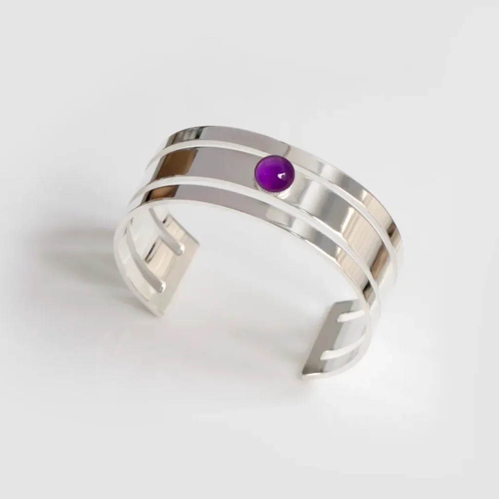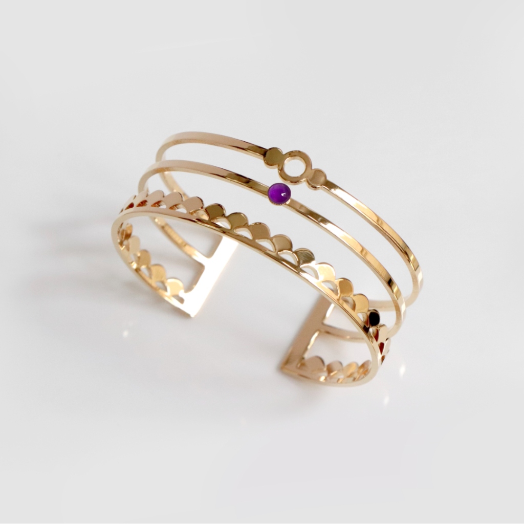 3. Un bracelet géométrique : Les bracelets géométriques utilisent des formes simples et modernes, comme des cercles, des triangles ou des rectangles. L’améthyste, pierre très tendance, donnera elle aussi au bijou son côté actuel.
