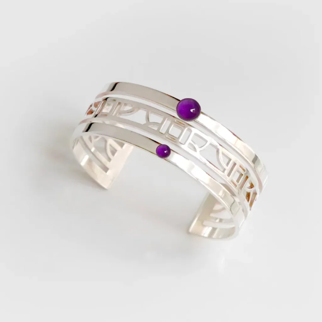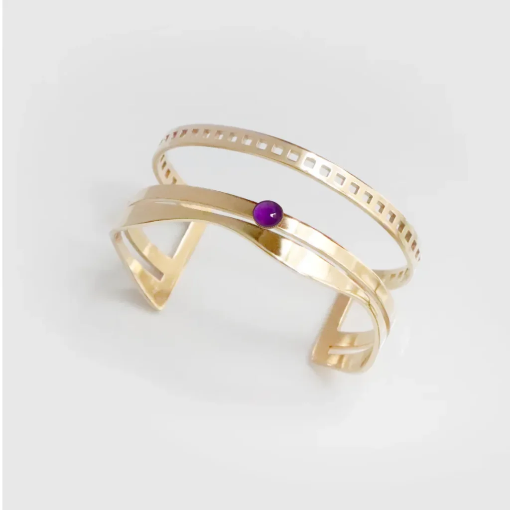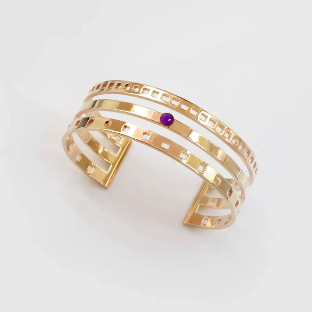 1. Un bracelet art-déco : Les bracelets de style art déco sont les plus originaux d’entre tous : avec leurs lignes imprévisibles, ils donnent à une tenue une touche différenciante, que ce soit dans une tenue simple ou une tenue elle-même plus extravagante. Accompagné d’une améthyste, nul doute que ses reflets envoutants renforceront cet aspect “unique” du bracelet !