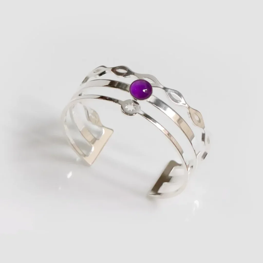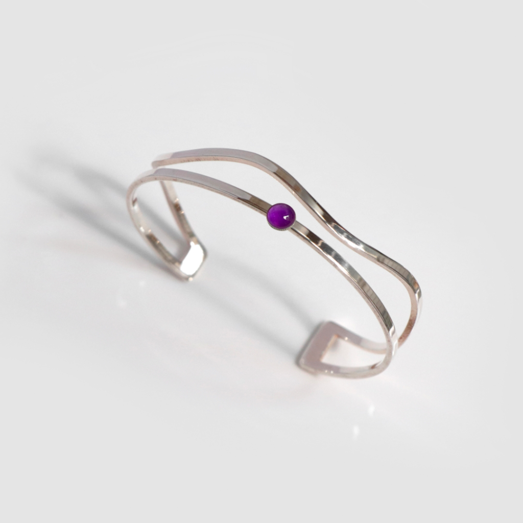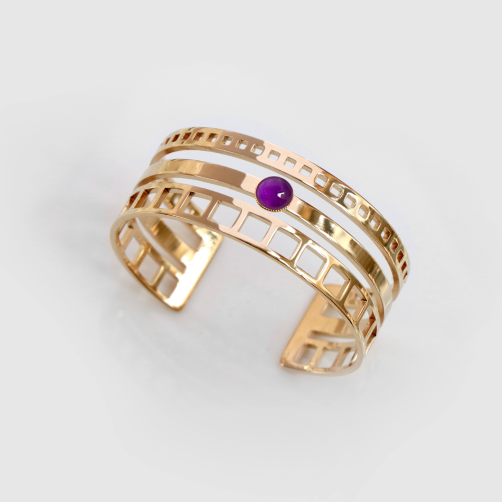 1. Un bracelet art-déco : Les bracelets de style art déco sont les plus originaux d’entre tous : avec leurs lignes imprévisibles, ils donnent à une tenue une touche différenciante, que ce soit dans une tenue simple ou une tenue elle-même plus extravagante. Accompagné d’une améthyste, nul doute que ses reflets envoutants renforceront cet aspect “unique” du bracelet !
