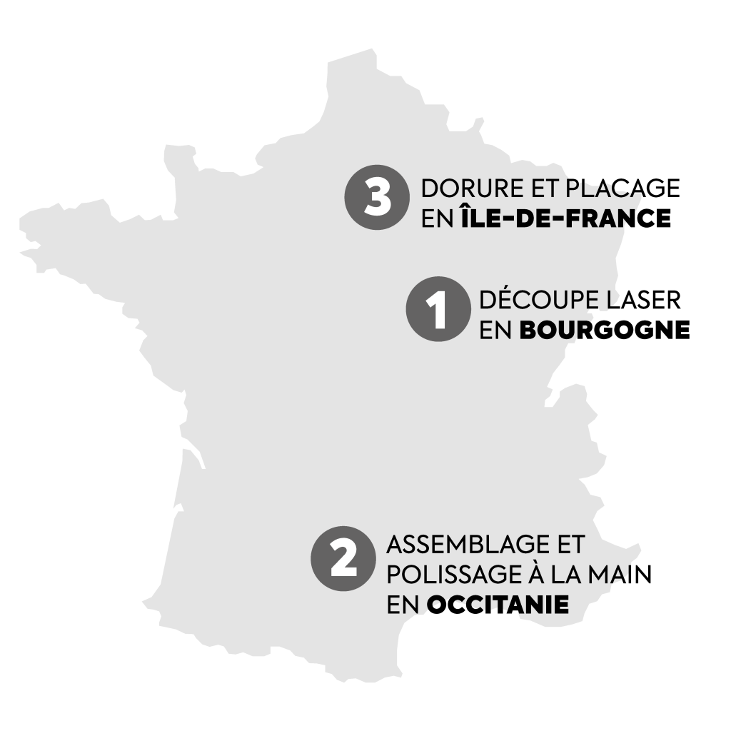 Nous avons choisi d’utiliser une base en laiton, recyclée et recyclable, qui sera par la suite dorée à l’or fin (1 micron) ou plaquée argent (10 microns) en fonction de ses goûts. Très conducteur, le laiton est un matériau fixant très bien les métaux précieux. De plus, la dorure ou l’argenture est réalisée dans un des meilleurs ateliers français, travaillant pour les plus grandes marques de luxe. Ceci nous permet de garantir tous les bijoux durant 2 ans, et de les voir vivre bien au-delà.