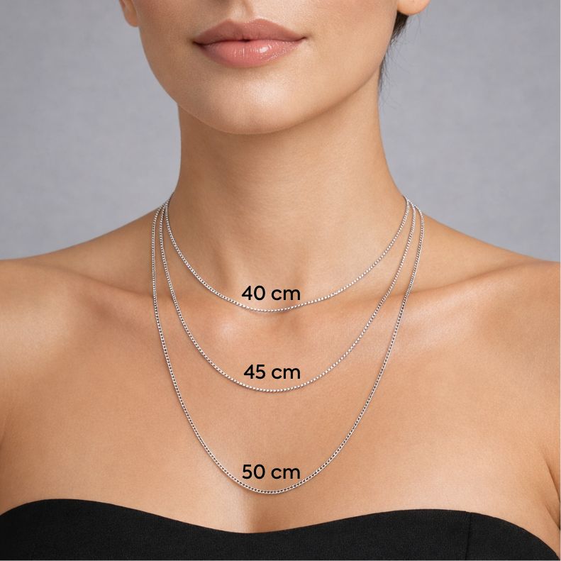 Afin de trouver votre longueur de chaîne idéale, mesurez et coupez une longueur de ficelle égale à celle du collier qui vous intéresse. Nos chaînes sont réglables : un fermoir est intégré à 2 endroits, espacés de 5 cm. Un collier ras du cou peut, par exemple, se porter en 40 cm ou en 45 cm.